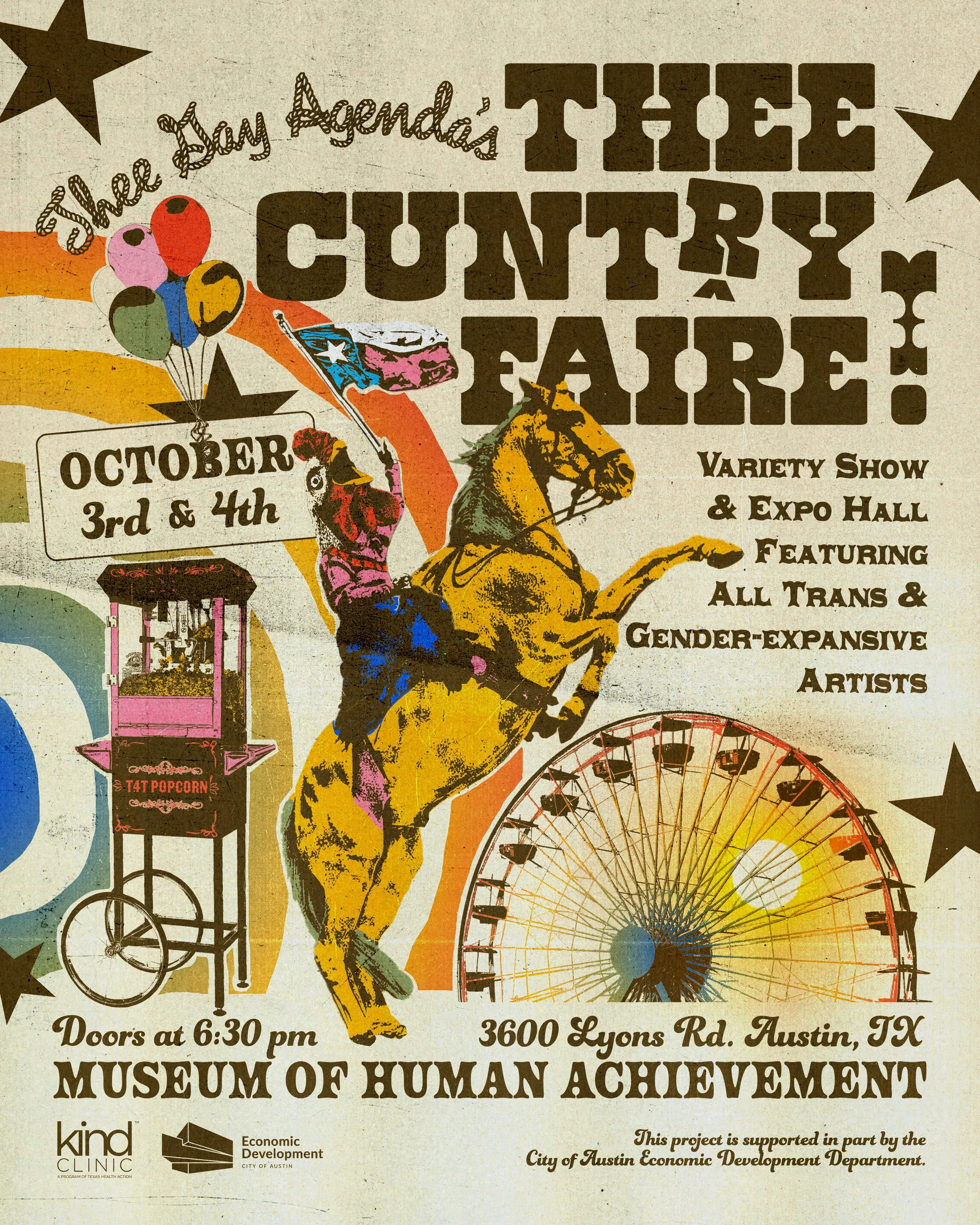 Don’t miss your chance to visit Thee Cuntry Faire — a variety show and gallery featuring all trans and gender expansive artists across performance, visual art, and immersive experiences.
